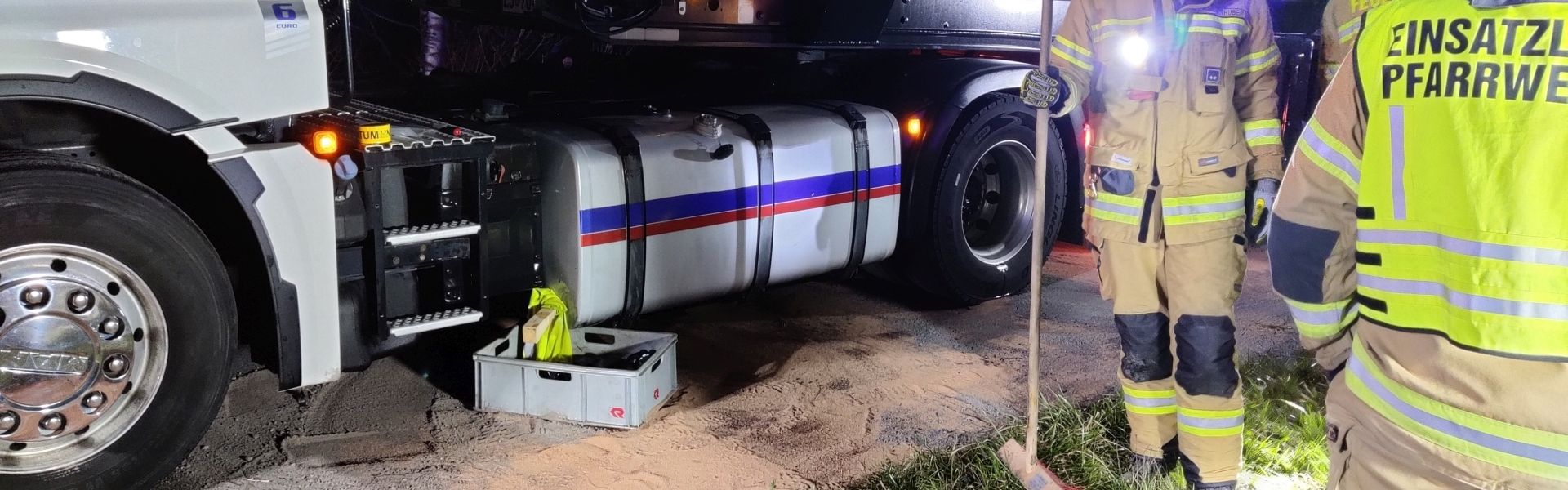 Da im Bereich der Betriebsumkehre eine enorme Menge Kraftstoff ausgetreten war – laut Polizeibericht zwischen 350 und 500 Liter – musste hier ebenfalls eine entsprechend große Menge Ölbindemittel von den beiden Feuerwehren eingesetzt werden. Außerdem wurde ein Teil des Diesels aus dem beschädigten Tank abgepumpt, um einen weiteren Austritt zu verhindern.