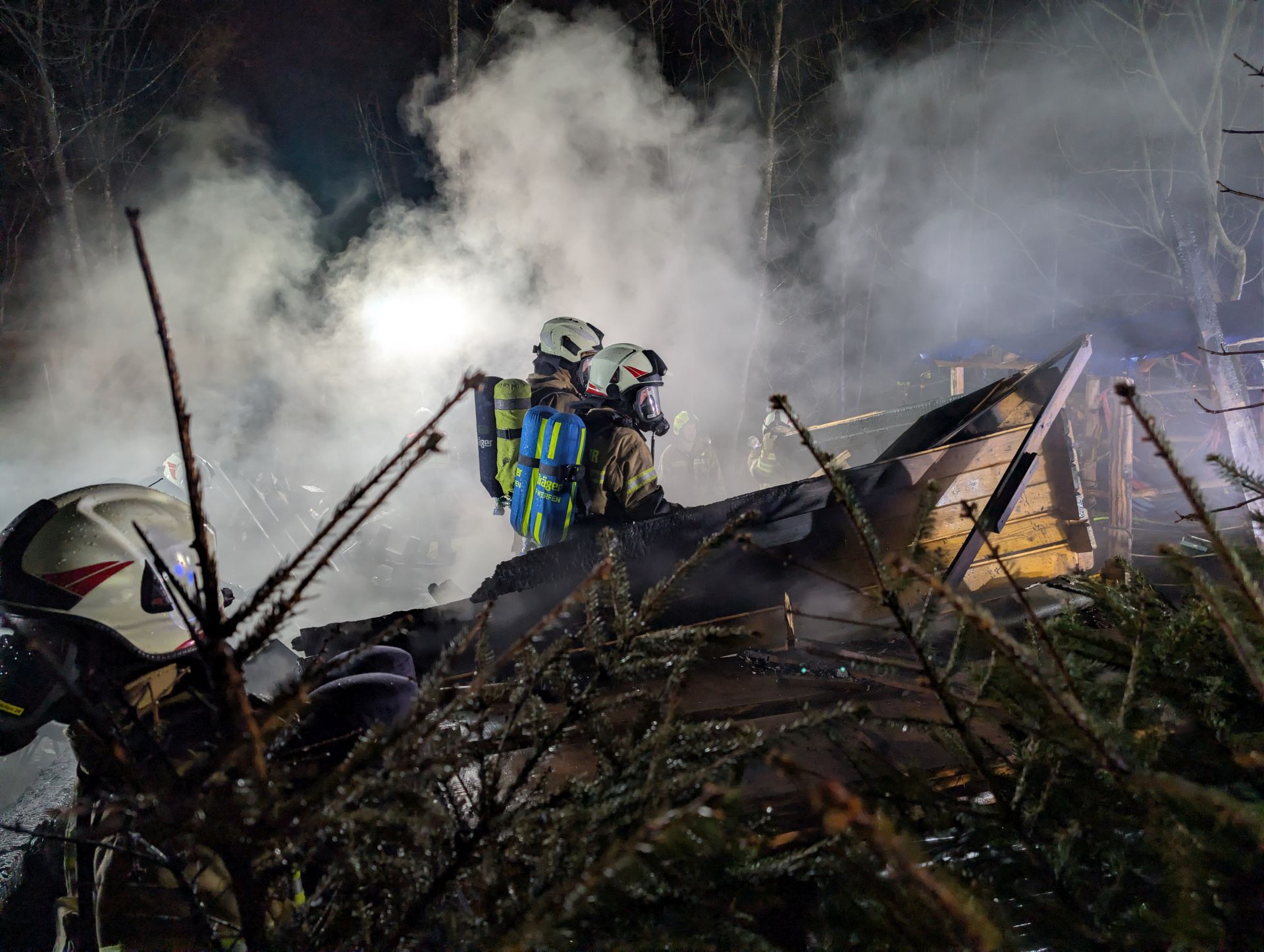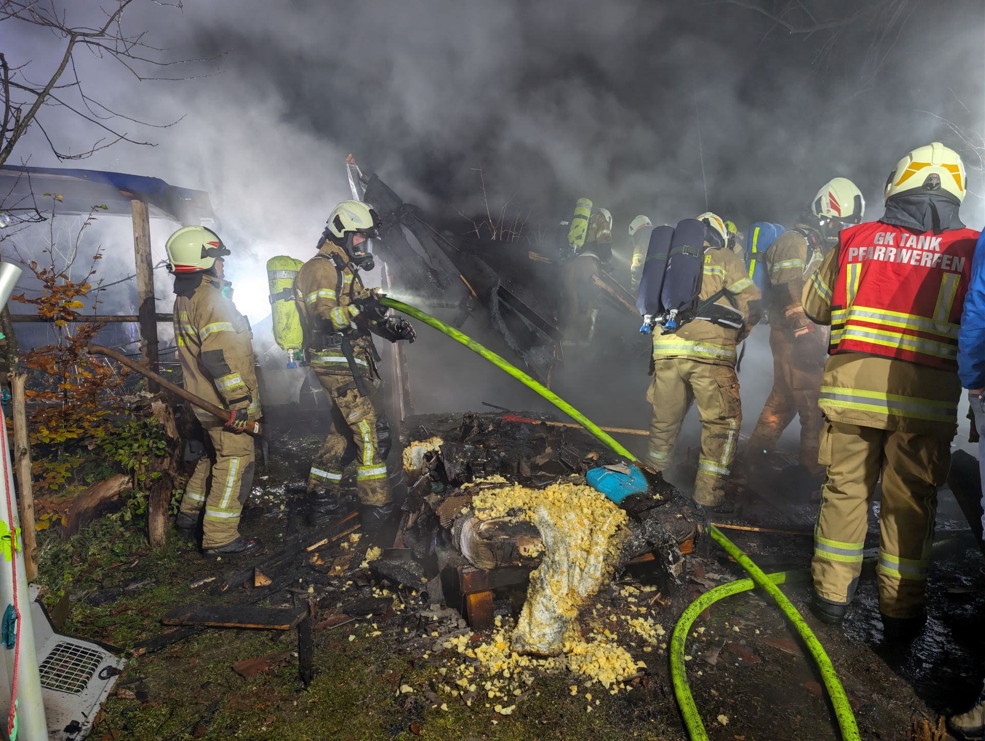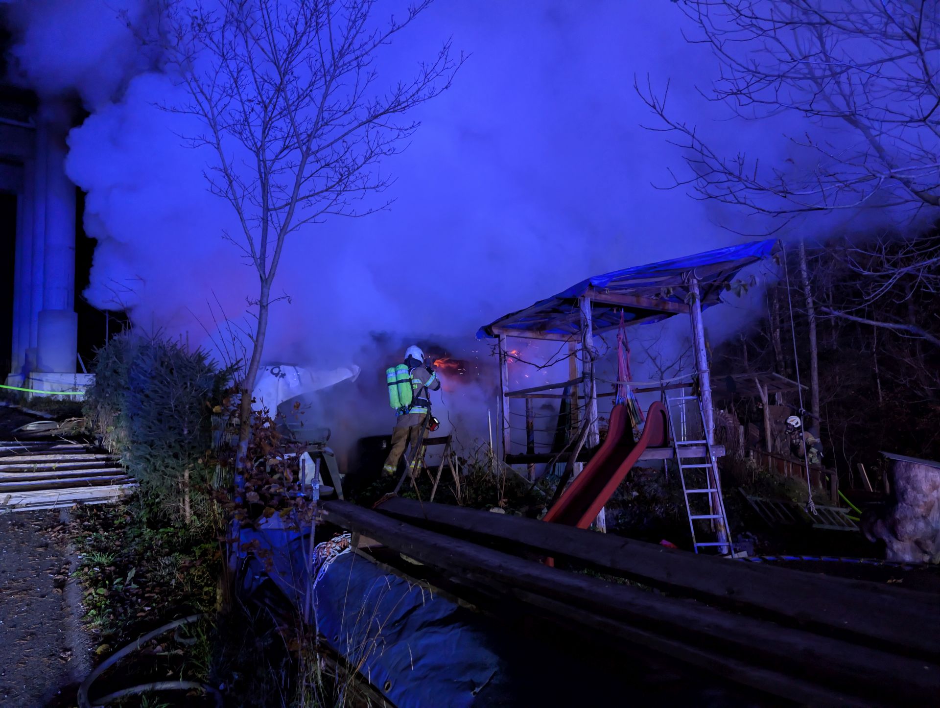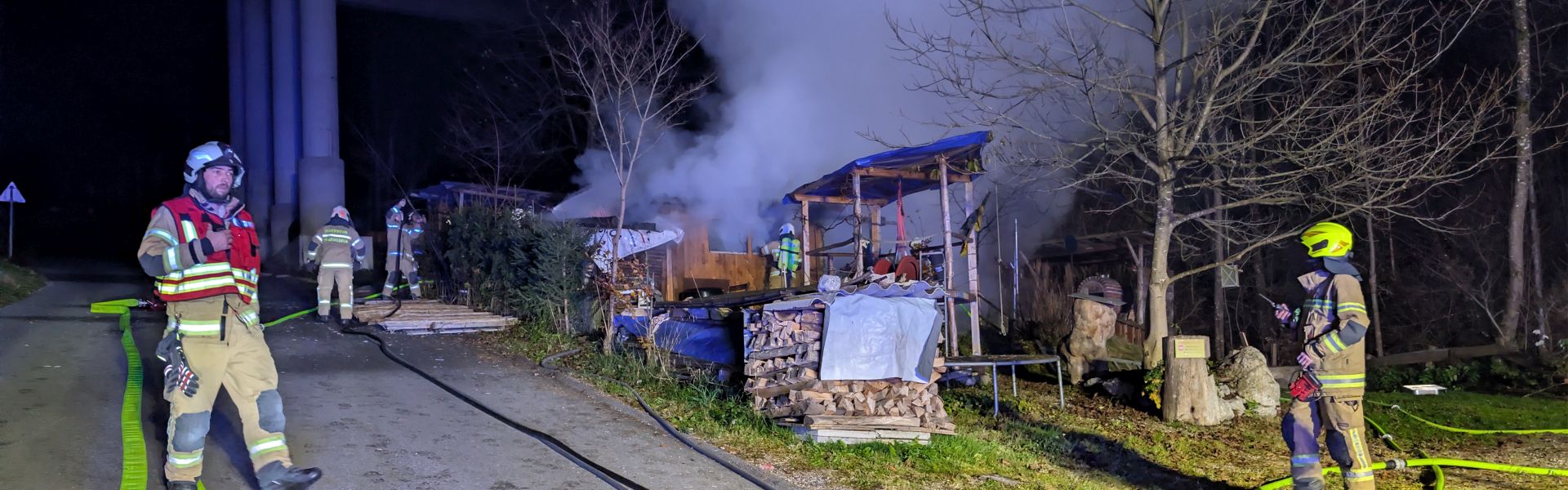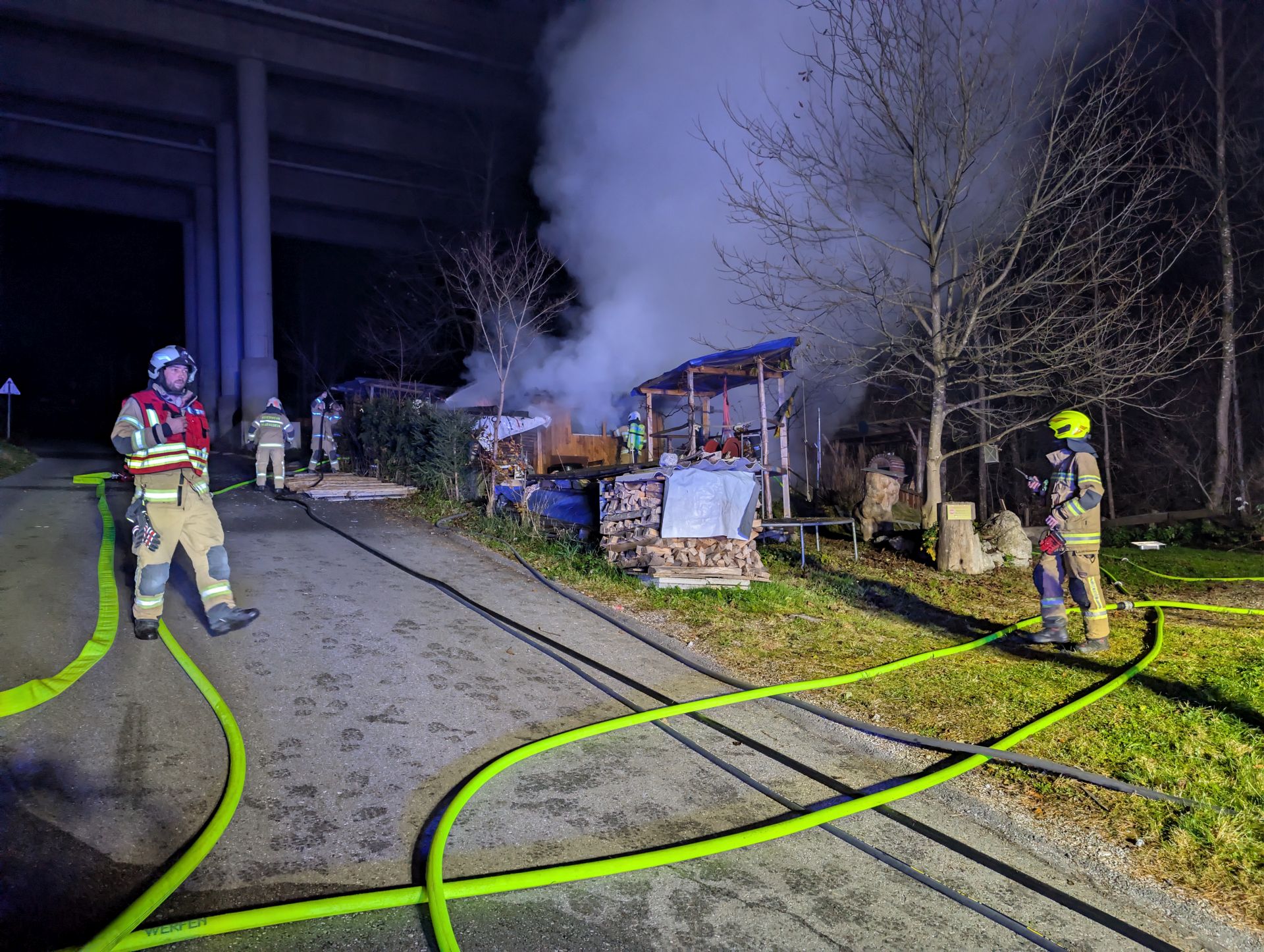 Die Feuerwehr Werfen traf zuerst beim Brandobjekt ein. Der Schuppen stand zu diesem Zeitpunkt bereits in Vollbrand. Ein Kamerad der Feuerwehr Werfen konnte gerade noch eine Gasflasche von der Terrasse bergen, deren angeschlossener Schlauch bereits Feuer gefangen hatte.