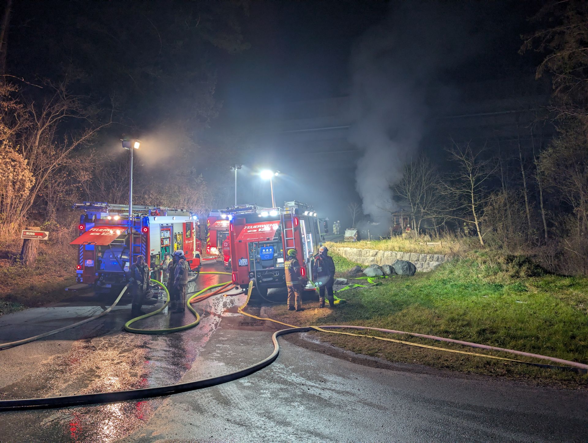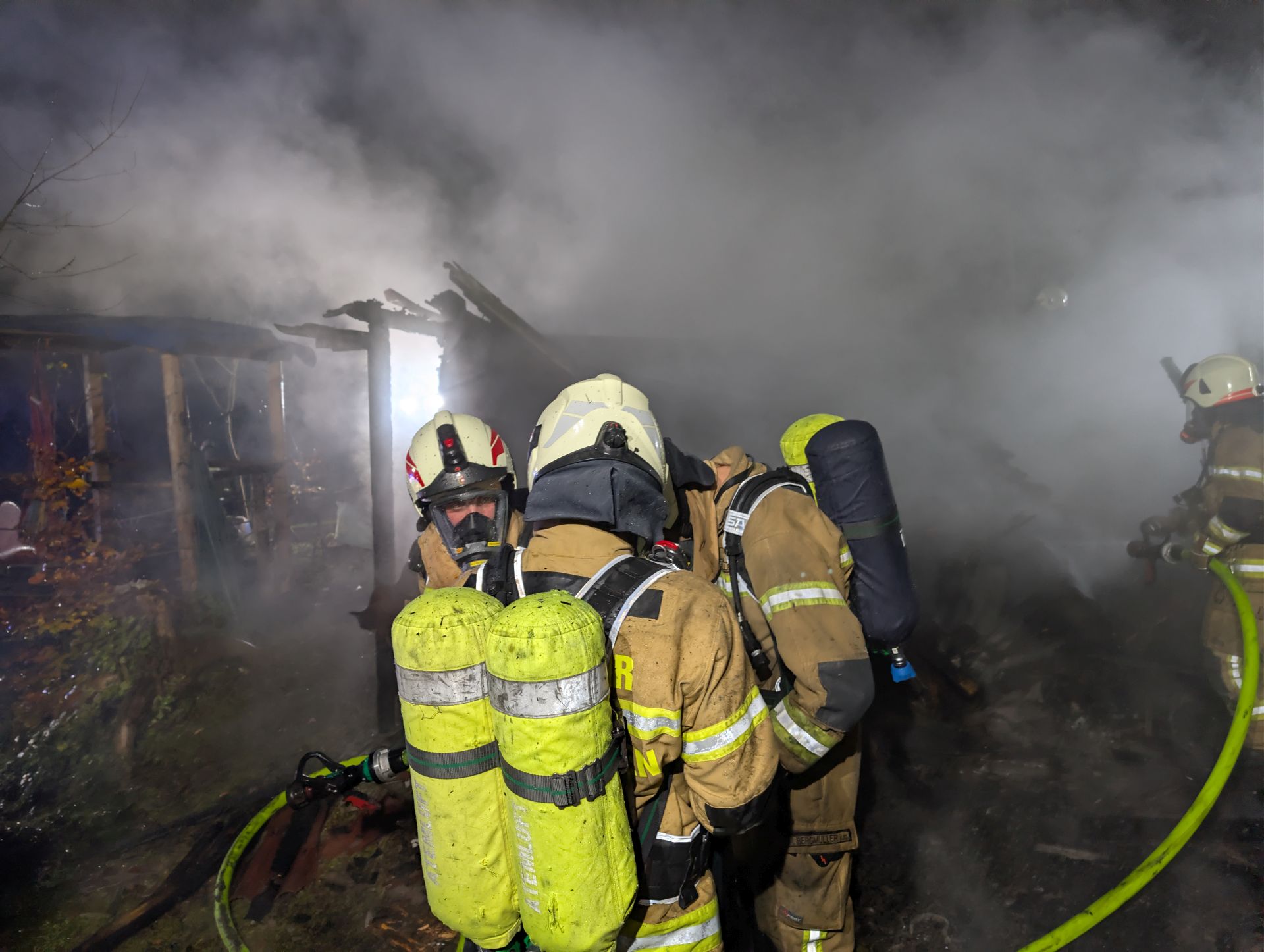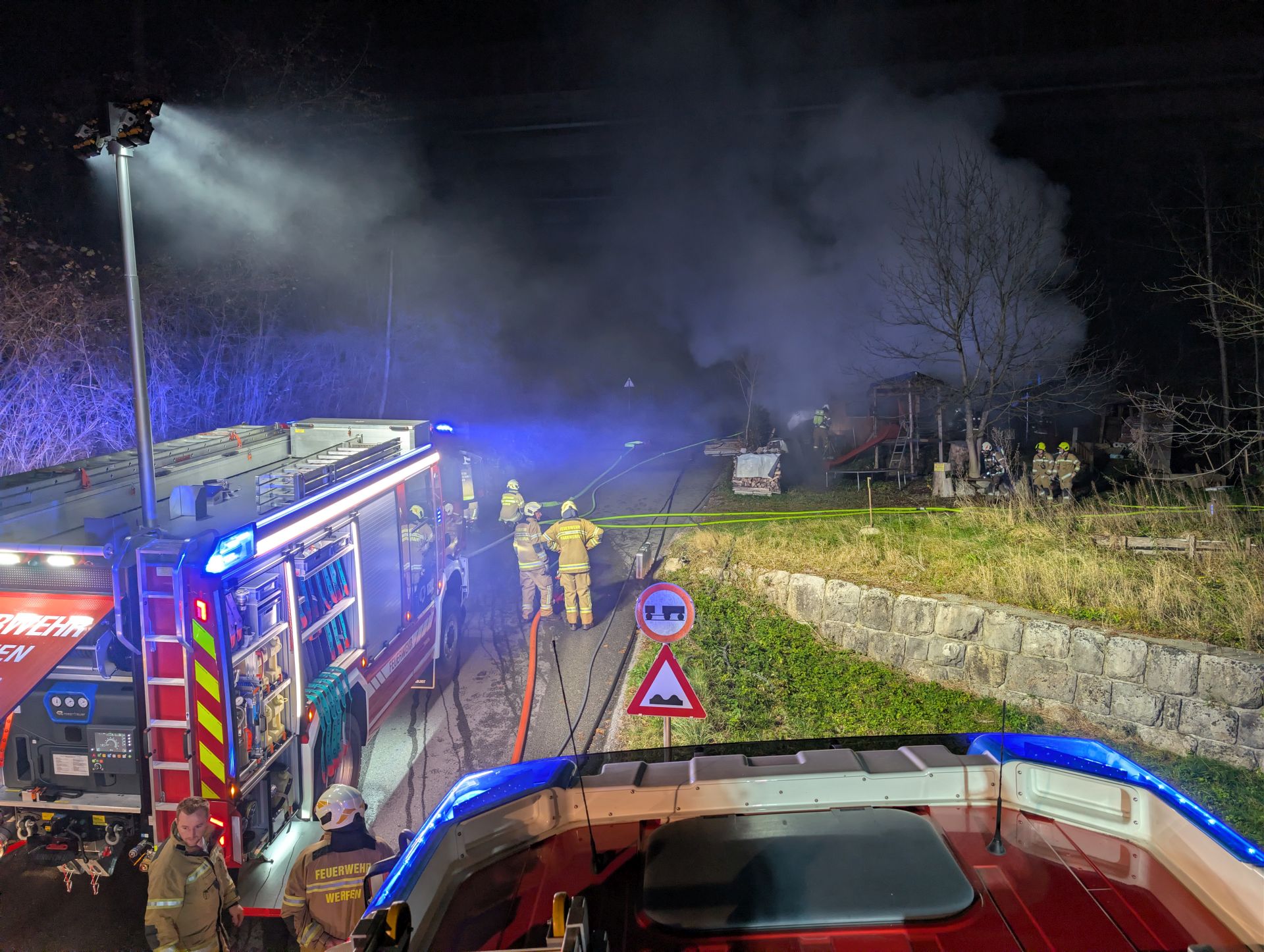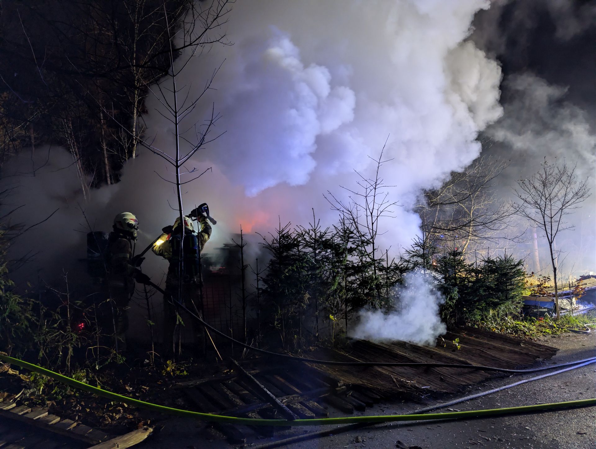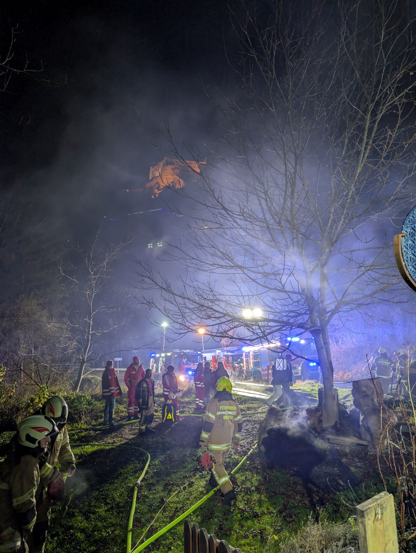 Die Feuerwehr Werfen traf zuerst beim Brandobjekt ein. Der Schuppen stand zu diesem Zeitpunkt bereits in Vollbrand. Ein Kamerad der Feuerwehr Werfen konnte gerade noch eine Gasflasche von der Terrasse bergen, deren angeschlossener Schlauch bereits Feuer gefangen hatte.