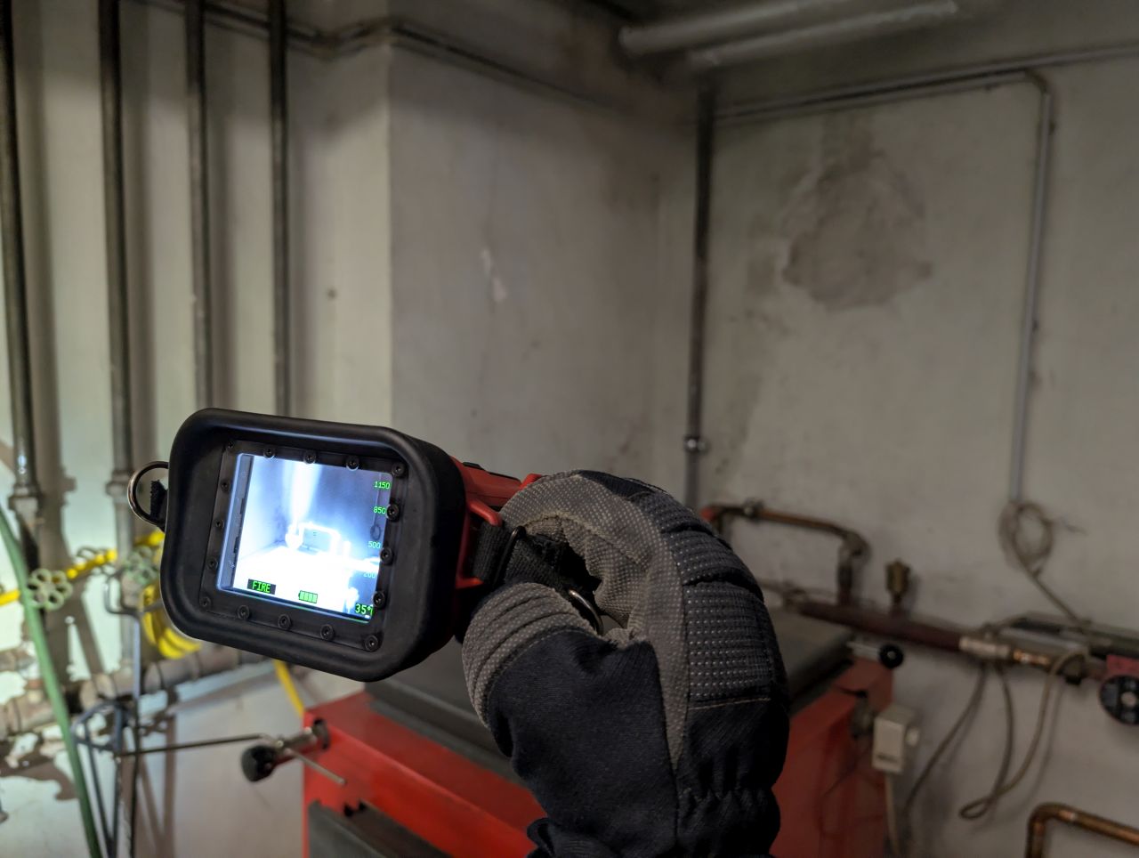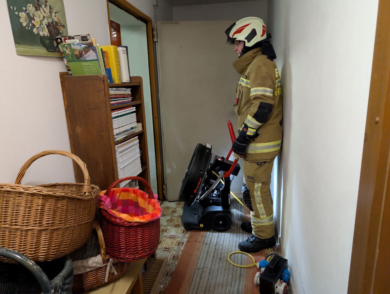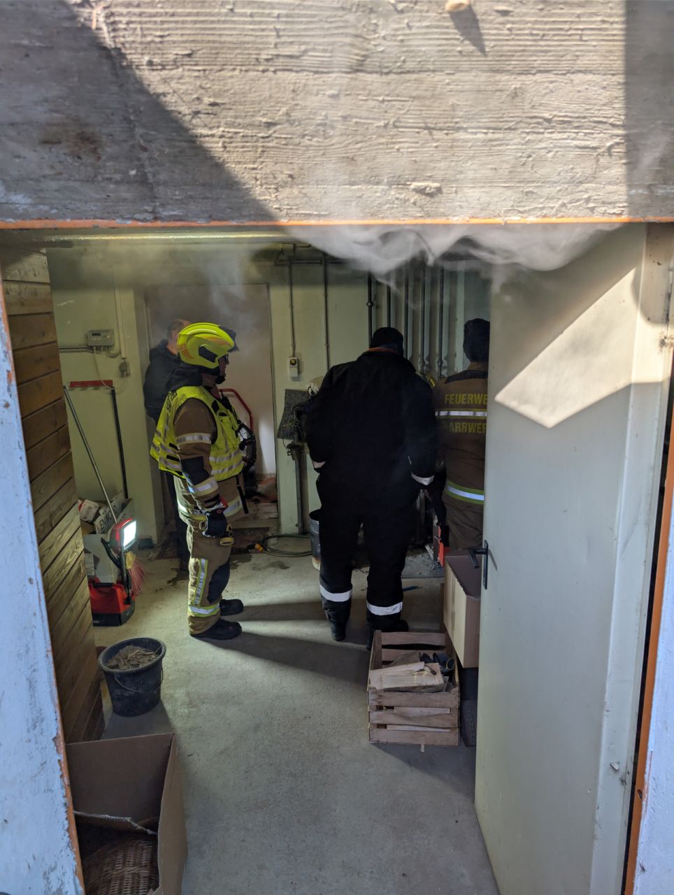 Noch während der Anfahrt rüstete sich ein Trupp mit schwerem Atemschutz aus. Beim Eintreffen am Einsatzort trat Dampf über ein Kellerfenster ins Freie aus. Mithilfe des elektrische Drucklüfters wurde der Kellerraum zunächst belüftet. Anschließend wurde die Heizungsanlage mit der Wärmebildkamera kontrolliert. Dabei konnte ein stetiger Temperaturanstieg in der Heizung festgestellt werden. Der Einsatzleiter entschied daher, den Ofen auszuräumen. Die Glut wurde vor dem Haus mit dem einem Hochdruckrohr abgelöscht.