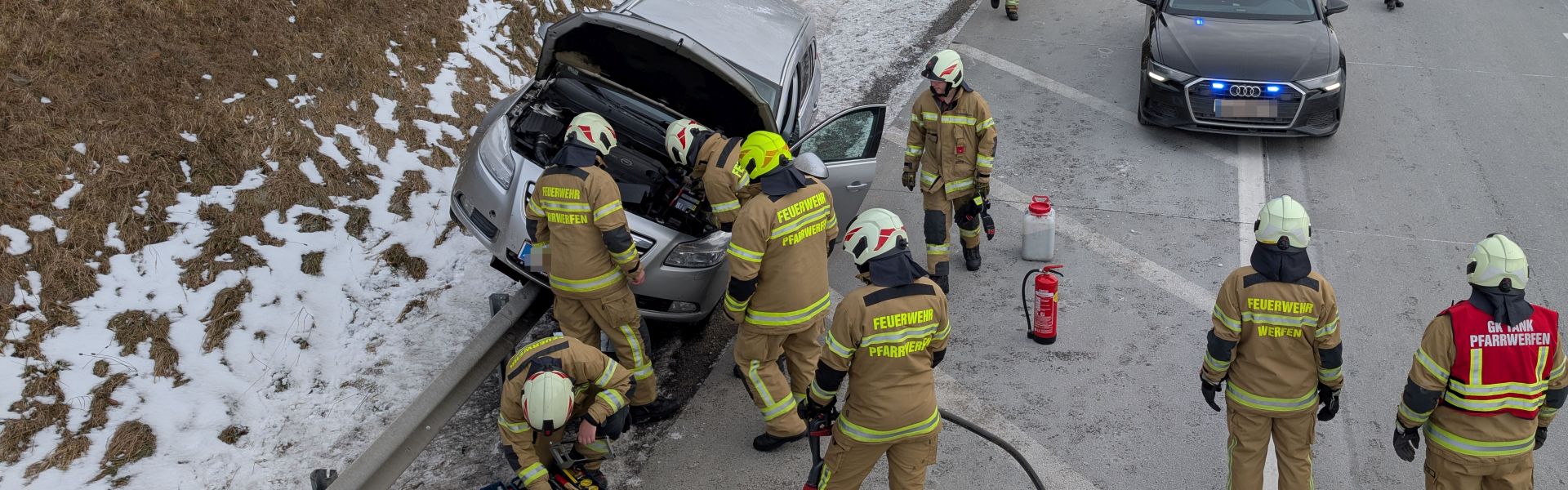 Montag Nachmittag um 15:11 Uhr wurden die Feuerwehren Pfarrwerfen und Werfen zu einem Verkehrsunfall auf der A 10 Tauernautobahn, Fahrtrichtung Salzburg alarmiert. Die Lenkerin eines mit zwei Personen besetzten Pkw hatte – vermutlich aufgrund eines technischen Defekts – die Kontrolle über ihr Fahrzeug verloren, war dabei rechts von der Fahrbahn abgekommen und auf die Leitschiene geschlittert. Dabei war die Ölwanne des Motor aufgerissen worden.