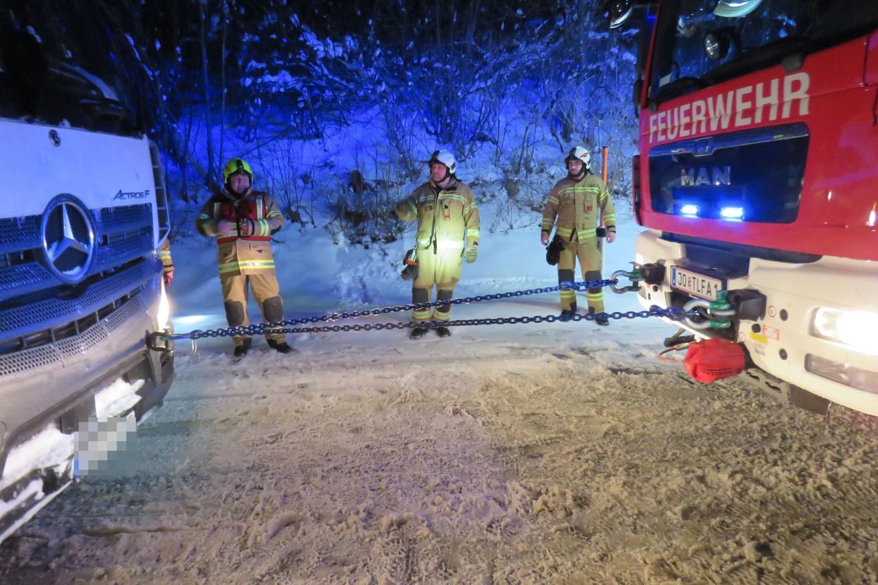 Der Lkw wurde schließlich mit der Einbauseilwinde des Tanklöschfahrzeugs aus dem Bankett gezogen und anschließend bis auf die Autobahn geschleppt, da ein Anfahren auf der glatten, ansteigenden Zufahrt für den Sattelzug nicht möglich war.